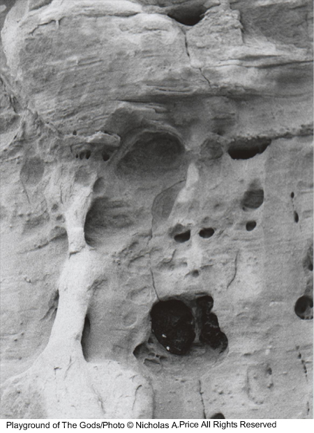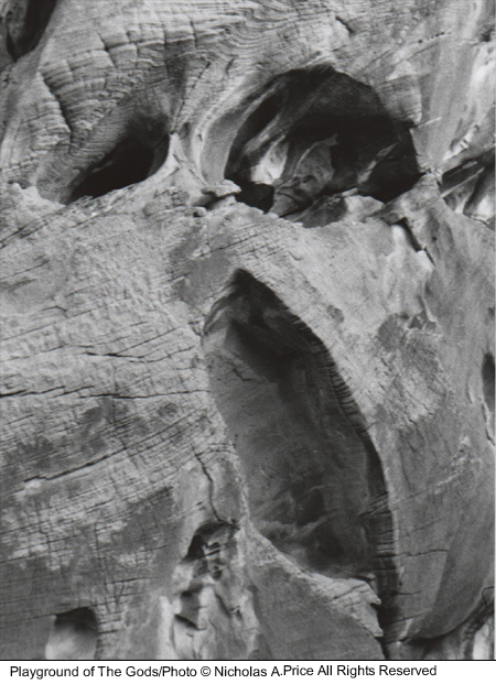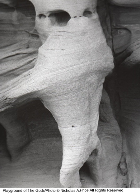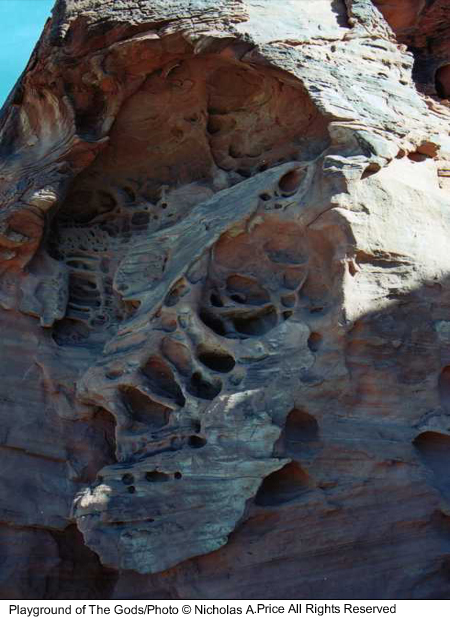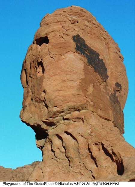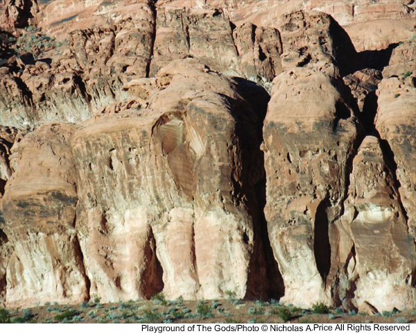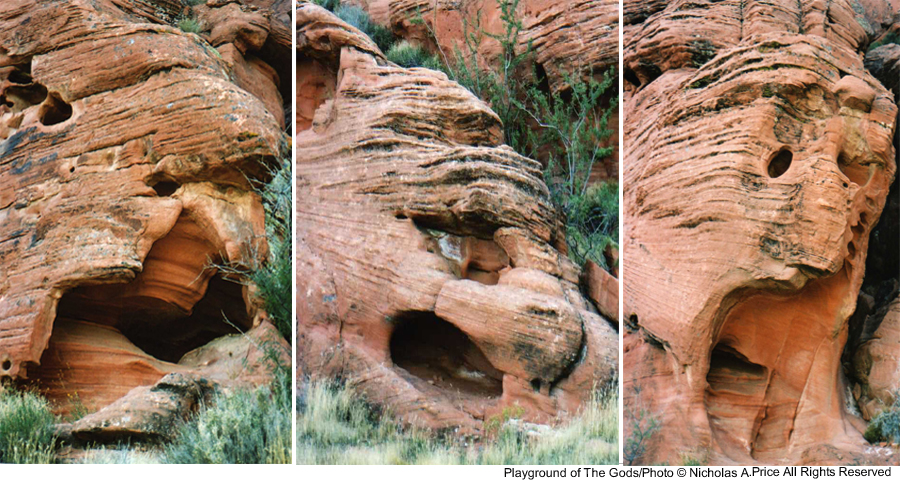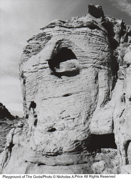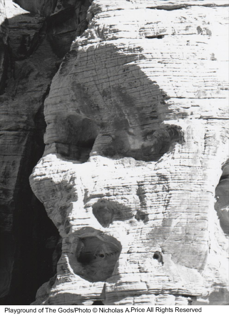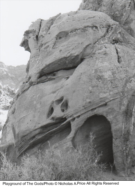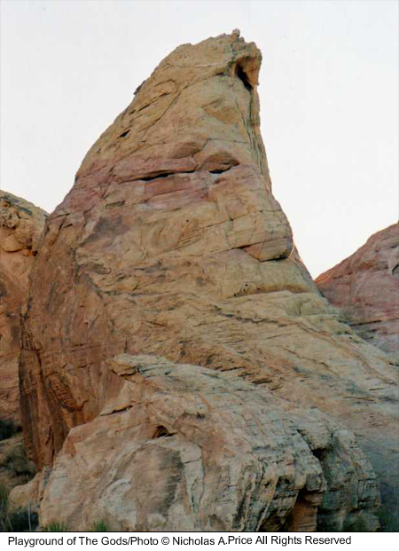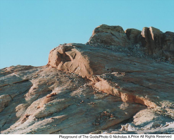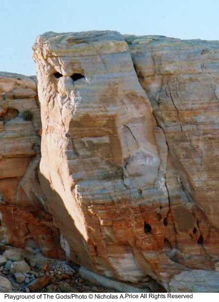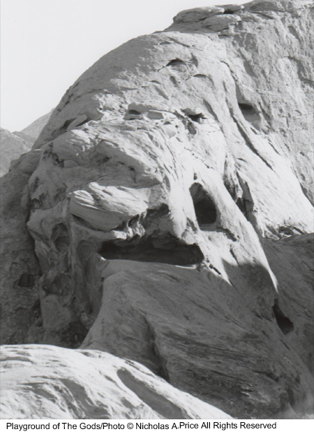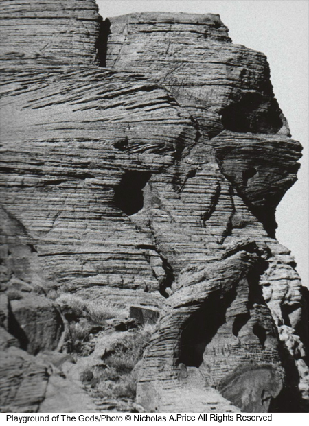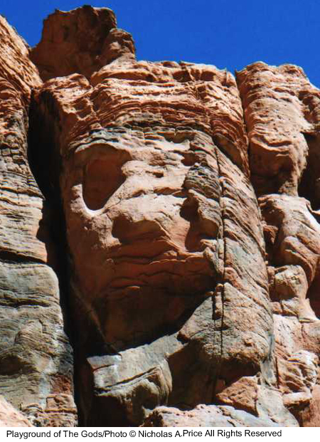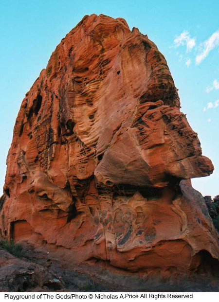 The spiritual energy of the past and present in rocks untouched for eons and laid down 150 million years ago. In this mass of color, texture and character, there are faces and creatures that can tell a story or two. The tests of time have taken their toll on these fragile images, and you could take heed in this, the Playground of the Gods. Here those experiments were conducted prior to completing the finished articles. These forms of man, woman and beast, those bodily shapes tested here, larger than life - and all you saw was a mass of rock. Well, here I will show you a little more in the Playground of the Gods.